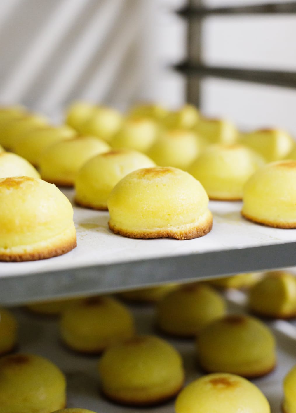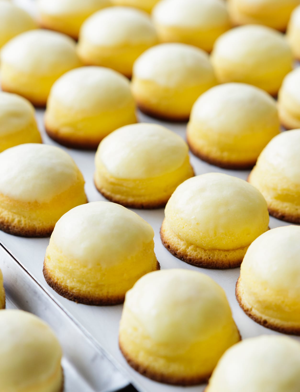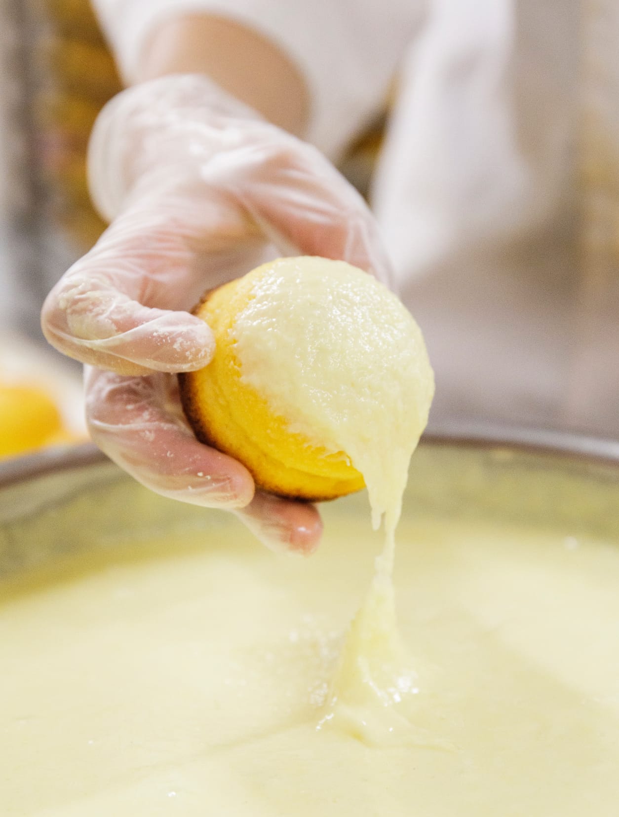 しっとり食感 - しっかりと果汁を加え、良質の卵とバターで作った生地。口の中でほどよくほどける食感にこだわって、ふんわりしっとり焼き上げています。真夏の沖縄に合うように、後味すっきりに仕上げました。